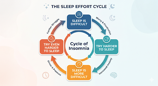 It is common to come across insomnia stricken people who have this kind of mental model of how sleep works. However, this model of sleep appears to be extremely far from the reality in that one may do all of the “right things”, but still fail to sleep well. As one unsuccessfully takes more steps to “solve” sleep, a sense of sleep anxiety often sets in. Just like anxiety about outside concerns, anxiety about sleep itself makes sleep worse. This is one possible positive feedback loop that can result in clinical insomnia.